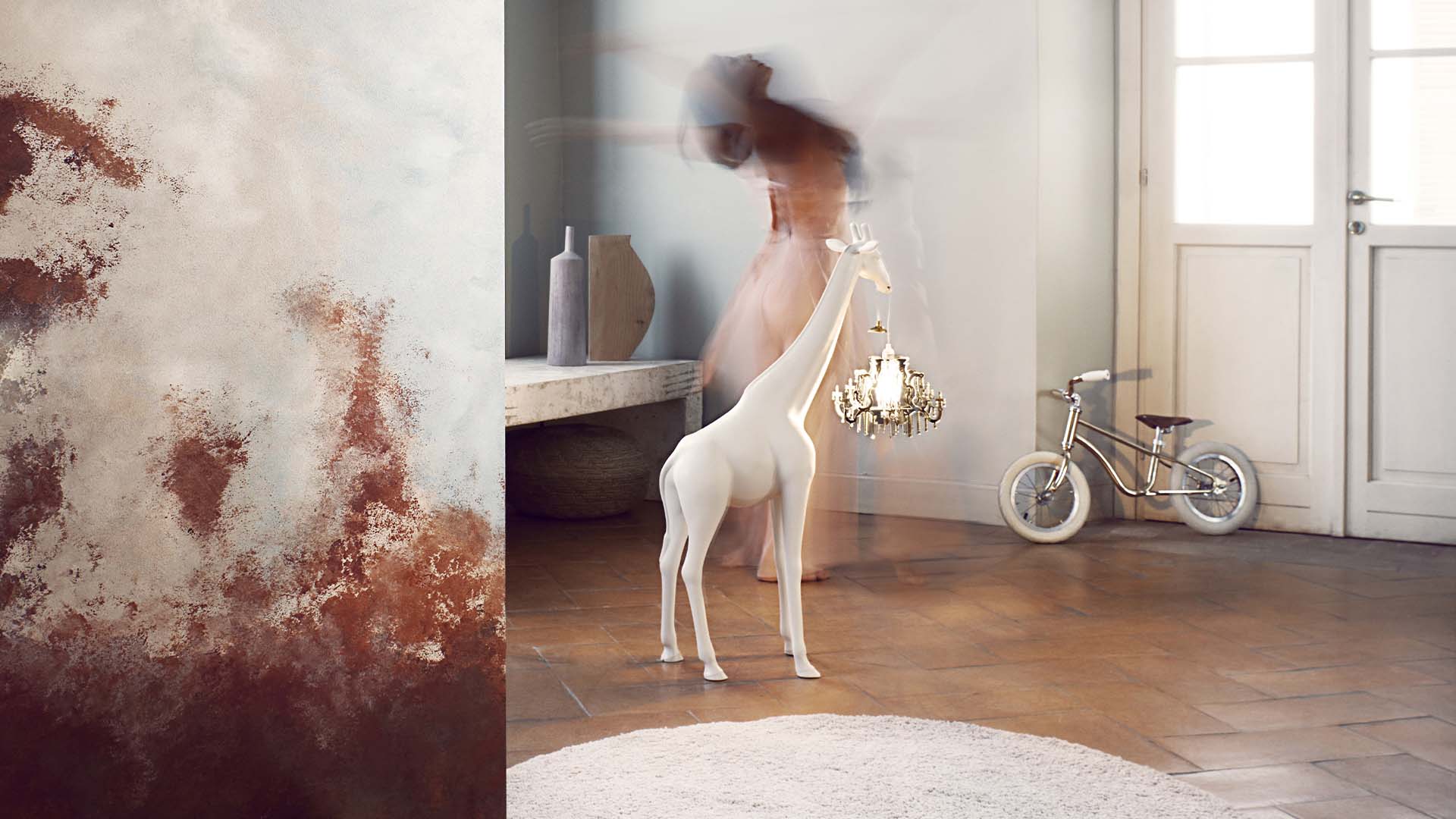 Finisaj decorativ de top pentru interioare, cu efect de „spălare” și modele metalice subtile.